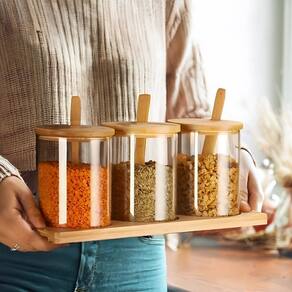 - Quantidade de Peças: 3 Porta Condimentos com suas respectivas tampas e colheres;