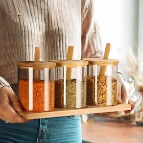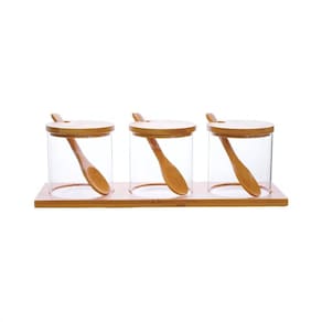 3 Porta Condimentos Com Tampa Colher Suporte Bambu 320Ml