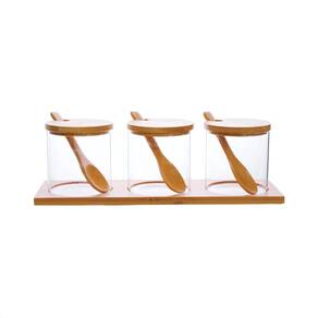 3 Porta Condimentos Com Tampa Colher Suporte Bambu 320Ml