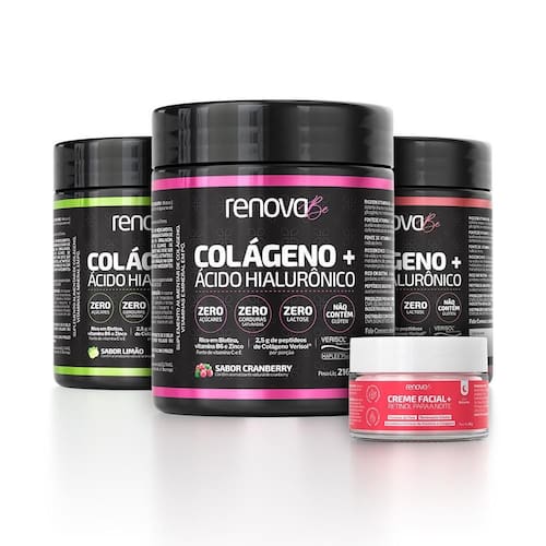 3 potes colágeno verisol renova be + 1 creme facial retinol Sabor: 1 cranberry + 1 limão + 1 pink lemonade Composto por 3 colágenos + creme retinol - colágeno 216g cada pote - creme 30g O colágeno renova be verisol com ácido hialurônico é um suplemento alimentar de alta qualidade, ideal para pessoas com mais de 19 anos. Com ingredientes como peptídeos bioativos do colágeno e ácido hialurônico, este produto é uma excelente opção para quem busca cuidar da saúde da pele, cabelos e unhas. Além disso, é livre de glúten e não contém lactose, sendo uma escolha segura para quem tem restrições alimentares. A embalagem contém 216g de pó, com uma porção de 12g que fornece nutrientes essenciais como fibras, proteínas, carboidratos e 50mg de ácido hialurônico. Recomendado para fins nutricionais, o colágeno renova be é uma opção prática e eficaz para incluir na rotina diária. Se você busca um suplemento de qualidade para cuidar da sua beleza de dentro para fora, experimente o colágeno renova be verisol com ácido hialurônico. Recomendação de uso - em um copo ou coqueteleira misture 1 colher de sopa aprox.12g em 150ml de água ou leite, consumir uma vez ao dia. Nossa recomendação é sempre usar água gelada. Somente o sabor chocolate contém lactose. Não contém glutén. Advertências: Este produto não é um . Não exceder a recomendação diária de consumo indicada na embalagem. Marca: Não Informado