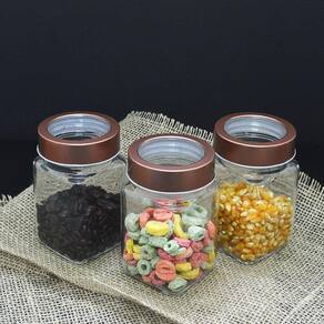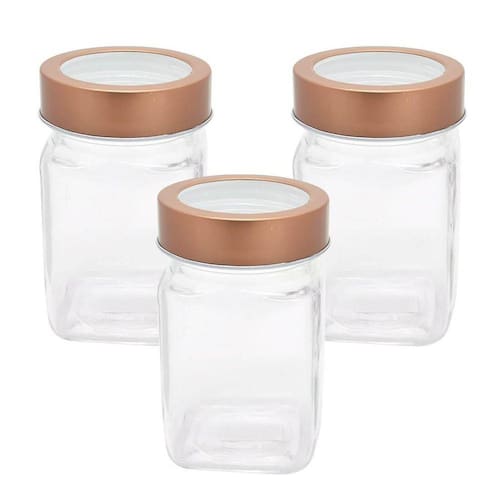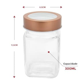 3 Potes De Vidro Quadrado Com Tampa Transparente Cobre 300Ml