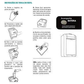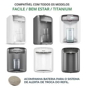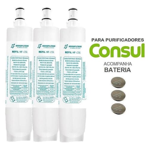 Kit 3 refis premium purificador consul cpc30 cpc31 cpb34 cpb35 cpb36... Refil premium + bateria para purificadores de água consul Compatível com todos os modelos:Facilite e bem estarCpc30 / cpc35 / cpc36 similar ao refil cix01ax Cpc31 / cpb34 similar ao refil cix06ax Vantagens 01 refil = 7.000 garrafas de 500 ml Redução do cloro Grau de filtração: classe c Retenção de partículas Cada filtro acompanha uma bateria nova para garantir o bom funcionamento do sistema de alerta de troca do filtro refil somente os modelos cpc30 e cpc 31 utilizam a bateria, pois não são ligados na tomada . Fazer a troca do filtro é realmente muito simples e leva cerca de 3 minutos. Junto dos filtros nós enviamos também nosso manual exclusivo com as instruções passo a passo de como fazer a troca. Nas instruções enviadas nós informamos como reiniciar a contagem da vida útil do refil, mas para saber como é fácil, siga esses passos:- modelo bem estar: pressione a tecla vida refil ao lado da bateria por 3 segundos, até ouvir o aviso sonoro confirmando a troca.- modelo facilite: retire o cabo elétrico da tomada, após alguns segundos ligue o cabo elétrico na tomada e pressione os botões de água gelada e natural simultaneamente por cerca de 5 segundos até ouvir o aviso sonoro confirmando a troca. O filtro remove o cloro da água, elimina sabores, retém partículas de sujeira, barro, ferrugem, eleva o ph, além de eliminar 96% de bactérias e micróbios. As marcas e produtos citados e ilustrados são propriedades de seus respectivos fabricantes e aparecem apenas para demonstrar a compatibilidade deste produto. Informações técnicasTemperatura de operação: 1c mín./40c máx.Pressão de operação: 29,4 kpa mín. A 392,3 kpa máx.Composição: polipropileno e carvão ativado granulado.Grau de filtração: classe c 5 a 15 micra Vazão máxima: 50 l/hPeso líquido: 0,172 kgPeso bruto: 0,224 kgDimensionais axlxp :258 mm x 53 mm x 53 mmDimensionais emb. axlxp :295 mm x 55 mm x 55 mmCom redução do cloro livre de no mínimo 75%Retenção de partículas Obs.: a consul não fabrica filtros e sim compra de fabricantes e coloca sua marca. A hidrofiltros e o principal fabricante de filtros da america latina. Possuindo os refis com os melhores desempenhos do mercado.