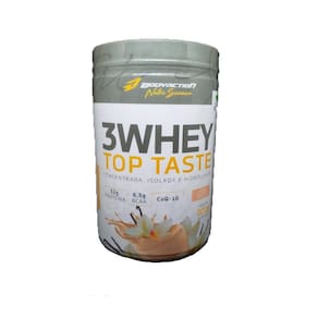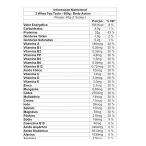O novo 3 whey top taste é composto por uma fórmula superior livre de xenobióticos (substâncias estranhas ao organismo) que foi desenvolvida com as mais nobres proteínas de alta concentração, absorção e biodisponibilidade: proteína isolada, hidrolisada e concentrada. Disponibilizando em apenas uma dose, 32 gramas de proteína. Além disso, traz como ingrediente especial a coenzima q10, com potente ação antioxidante que reduzirá o risco de lesões musculares. Também possui vitaminas e minerais que auxiliarão na absorção dos nutrientes.
