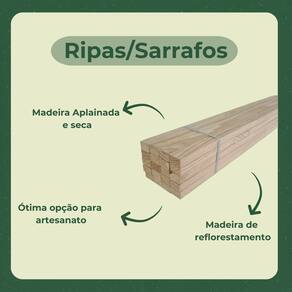 Características: Ripa/Sarrafo de mandeira aplainada. Madeira Ecológia, proveniente de reflorestamento sustentável Sem nenhum tipo de tratamento Madeira natural de Pinus Madeira seca Cantos retos