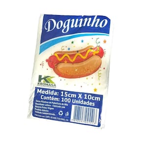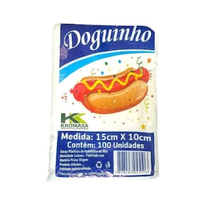 Saco Plastico para Hot Dog 15x10 - Com 3000un Kit 30 pacotes de sacos plásticos para Hot Dog Doguinho com 100 unidades cada, total 3000 unidades. Descrição: Material: Plástico Cor: Branco leitoso Quantidade: 3000 unidades - 30 pcts com 100 cada Tamanho:15x10cm Marca: Kromassa Ean: 7793140221574
