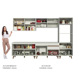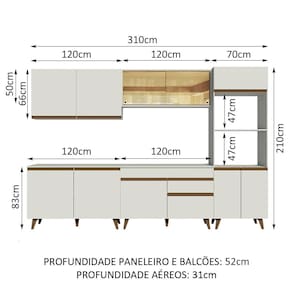 As medidas totais são: 310 cm de largura e 210 cm de altura. A profundidade é de cozinha planejada: 52 cm nos balcões e na torre e 31 cm nos aéreos.