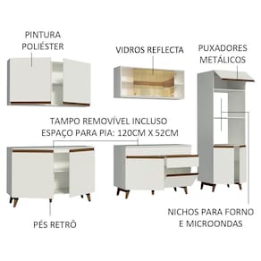 Todos os módulos são avulsos, fabricados com materiais de padrão superior, como corrediças e dobradiças metálicas. Os puxadores são embutidos, em alumínio na coloração marrom e os pés em madeira são muito bonitos e conferem firmeza e resistência ao móvel.