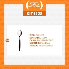 Componentes do KIT: - 36 Colheres de Mesa Ipanema Com Lâmina Em Aço Inox Cabo Preto CPTOP - Tramontina Colher de Mesa Tramontina Ipanema com Lâmina em Aço Inox e Cabo de Polipropileno Preto 23363400 : 90 dias para vícios ou defeitos de fabricação Praticidade e qualidade para o seu dia a dia, você encontra na Colher de Mesa Tramontina Ipanema com Lâmina em Aço Inox e Cabo de Polipropileno Preto. Ideal para deixar o seu dia a dia mais elegante, ela tem lâmina produzida em aço inox com espessura que lhe garante alta resistência e durabilidade. Seu cabo é em polipropileno preto e proporciona um manuseio muito confortável, além de compor sua mesa de um jeito muito mais moderno e cheio de estilo. Ela ainda é muito fácil de limpar e pode ser lavada na máquina de lavar louças, facilitando sua rotina na cozinha. A colher perfeita para lhe acompanhar nas principais refeições - A lâmina de aço inox garante maior resistência devido a espessura do aço e a estampagem da lâmina. - O cabo de polipropileno possui maior resistência e durabilidade. - Pode ir à máquina de lavar louças facilitando seu dia a dia. - Peso Líquido: 0,028 kg. - Peso Bruto: 0,028 kg. - Medidas Externas: 19cm x 4cm concha x 1,7cm - Medidas Embalada: 11cmA x 7cmL x 19cmP