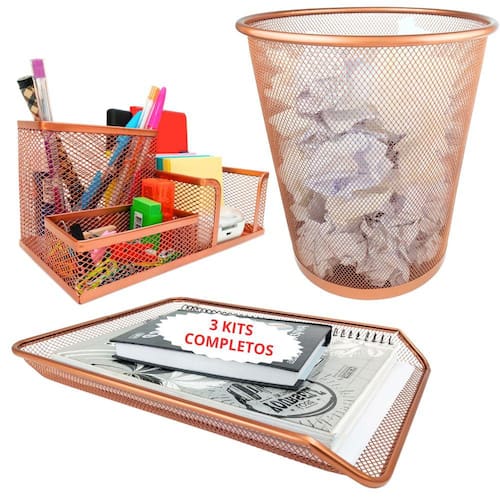 KIT COMPLETO DE ESCRITÓRIO COM 9 PRODUTOS ROSE GOLD - CESTO LIXO, PORTA CANETA ORGANIZADOR DE MESA E BANDEJA ORGANIZADORA PARA DOCUMENTOS