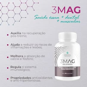 O 3 MAG POOL 90 Cápsulas Central Nutrition é um suplemento alimentar inovador em cápsula que fornece 310 mg de magnésio elementar em três formas avançadas: dimagnésio malato, bisglicinato de magnésio e taurato de magnésio.