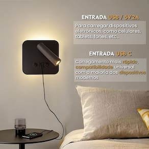 - O grande diferencial está na sua entrada USB e USB-C integradas, que permitem carregar seus dispositivos móveis com facilidade, diretamente na arandela - ideal para quem busca praticidade no dia a dia.