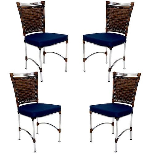 Características: Peças produzidas em alumínio polido e revestidas em fibra sintética com proteção UV.Nossos produtos são artesanais e podem ocorrer variações na medida de até 2cm. As cores dos produtos podem variar de acordo com o ambiente e com a iluminação em que as fotos foram tiradas.Estofado em couro náutico da kelsons ou tecido acquablock da karsten. Suporta até 170 kg Itens inclusos: 4 Cadeiras JK em AlumínioDimensões:Altura total: 94 cm Altura assento ao chão: 50cm Largura: 48 cm Comprimento: 44cm Peso: 23 kgGarantia do fornecedor: 12 mesesDúvidas frequentes:Quais as cores disponíveis?Temos 11 opções de cores disponíveis para fibra sintética e mais de 30 opções disponíveis para os estofados. Como escolher a cor do produto?Após a confirmação do pagamento ficará disponível um campo de mensagens entre o vendedor e o comprador, por lá será acertado todos os detalhes referentes as cores do produto escolhido antes de ser encaminhado para a produção.Os produtos podem ficar expostos ao tempo? A estrutura pode ser molhada e utilizada em áreas abertas, expostas ao sol e chuva. O estofado, por mais que seja o impermeável da karsten ou o náutico da kelsons, é resistente à agua (se cair um copo de água por exemplo, não haverá problema), mas não pode ficar totalmente exposto a chuva.