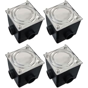 Fabricada em plástico injetado, a caixa de passagem Pooltec possui tampa em Aço inox fixada com quatro parafusos em aço inox e quatro saídas opcionais de 3/4 soldável. Tem por finalidade facilitar a manutenção e instalação da iluminação subaquática da piscina.