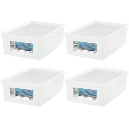 Garantia: 90 dias / Peso total: 1,440kg / Cor predominante: transparente / Ref: 7798139154741; Dimensões internas de cada caixa: 35,5cm (C) x 23cm (L) x 10cm (A); Dimensões totais de cada caixa: 40,5cm (C) x 25cm (L) x 11,5cm (A); Tamanho G: ideais para calçados 38 a 46; Capacidade: um par por caixa; Material: polipropileno; Conteúdo: 4 caixas plásticas para calçados; Obs.: caixas empilháveis com tampas ventiladas; Cuidados: não utilizar materiais químicos ou abrasivos na limpeza.