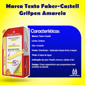 MARCA TEXTO FABER CASTELL AMARELO NEON - KIT COM 4 UNIDADES O Marca Texto Pilot é indicado para destacar informações em textos impressos ou escritos à mão, auxiliando na organização e na leitura de conteúdos. Possui tinta neon na cor amarela, que garante excelente visibilidade sem comprometer a legibilidade do texto. A embalagem contém 4 unidades , sendo uma opção prática para uso frequente em atividades de leitura, estudos e organização de materiais. CARACTERÍSTICAS DO PRODUTO