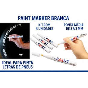 Destaque suas rodas e dê um toque personalizado ao seu carro ou moto As Canetas Paint Marker Brancas são ideais para pintar e realçar as letras dos pneus, garantindo um visual esportivo, moderno e cheio de estilo. Além disso, ficaram famosas no mundo sneakerhead, perfeitas para customizar solados de tênis Boost, , e outros . Com tinta permanente à base de óleo, são resistentes à água, não desbotam facilmente e garantem acabamento uniforme e duradouro. Diferenciais do Produto Kit com 4 unidades - melhor custo-benefício. Tinta à prova dágua e permanente. Ideal para pneus de carros e motos. Muito Utilizado para customização de tênis. Corpo em alumínio resistente. Ponta média de 2 a 3 mm, fácil de controlar. Indicações de Uso Pintar letras de pneus carros e motos . Customização de tênis e solados. Personalização de objetos, plásticos e metais. Desenhos e artesanato em geral. Modo de Usar Agite bem a caneta antes de usar. Pressione a ponta contra um papel até a tinta descer. Aplique na superfície limpa e seca. Espere secar e pronto Quantas canetas preciso para pintar 1 pneu de moto 1 caneta para contorno. 2 canetas para preenchimento completo. Quantas canetas preciso para pintar os 4 pneus do carro 4 canetas para contorno. 5 a 6 canetas para preenchimento completo. Especificações Técnicas Condição: Novo, lacrado. Cor: Branco. Tipo: Acrílica à base de óleo. Espessura da ponta: 2 a 3mm. Garanta já o seu kit e deixe seu carro, moto ou tênis com um visual único e estiloso