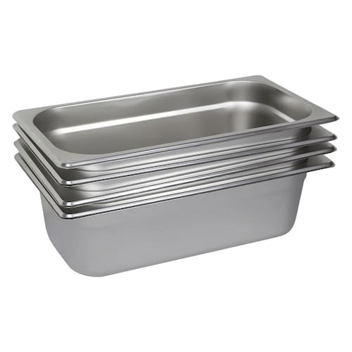 Kit com 4 cubas GN 1/9 de 100mm. Sirva com padrão e eficiência em buffets com grande variedade e espaço otimizado.