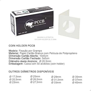 O Coins Holder é uma importante ferramenta para armazenar e proteger suas Moedas. É um produto utilizado por colecionadores e coleções de todos os níveis: do iniciante ao avançado. Garante o bom armazenamento e proteção de suas peças.O Coins Holder tem como função proteger sua moeda:- evita o contato com o ambiente externo- evita o manuseio incorreto da peça (sem luvas ou com a mão suja)- facilita a exposição de sua peça na sua coleção- facilita a logística de sua peça, permitindo que você leve em eventos ou para negociar com mais praticidade e proteção- excelente organizador, pois centraliza a moeda no bolso da folha, deixando sua exibição muito mais bonita, organizada e apresentávelNo critério de organização, o Coins Holder se destaca ao promover a padronização da exposição de suas moedas. Tenha uma apresentação muito mais bonita e profissional utilizando Coins Holders.CARACTERÍSTICAS:Modelo: Fixação por GrampoMaterial: Papel Cartão Branco com Película de PolipropilenoDimensão Cartão Aberto: 10x5cmDimensão Cartão Fechado: 5x5cmDiâmetro deste Anúncio: Ø 20,5mmEmbalagem: Caixa com 50 alvéolos (coins holder) cada caixaSUGESTÃO DE ARMAZENAMENTO DO COINS HOLDER COM A MOEDAO Coins Holder pode ser armazenado em folhas próprias para coleções de Moedas respeitando o espaço mínimo de 5x5cm cada bolso onde o holder será colocado, caixas organizadoras e separadoras, estojos (cartelas dobráveis) próprios para Coins Holders.COMO UTILIZAR:1- Para utilizá-lo você deve primeiramente dobrar ao meio, na marcação indicada, para facilitar o fechamento com a moeda.2- Em seguida, você deverá posicionar a moeda no centro do Coins Holder, em cima da película de plástico, onde a moeda será exibida. Certifique-se de que sua moeda está perfeitamente alinhada com alguma das laterais do Coins Holder pois após fecha-lo, não conseguirá mais mover a moeda.3- Dobre o coins holder ao meio, por cima da moeda, envolvendo-a completamente.4- Com um grampeador, grampeie a parte branca do Coins Holder. É sugerido que o grampo seja aplicado bem posicionado entre a moeda e o final do Coins Holder, pois assim prenderá corretamente a peça evitando que a mesma movimente. Também é sugerido 4 grampos para o bom fechamento do Coins Holder, mas fica a critério de cada colecionador.