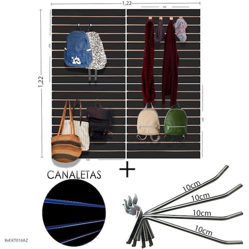 DESCRIÇÃO: 4 unidades de painéis canaletados 0,61 X 0,61 + 100 Unidades de Ganchos Zincados (Tamanhos dos ganchos devem ser selecionados no ato da compra) + Canaleta AZUL