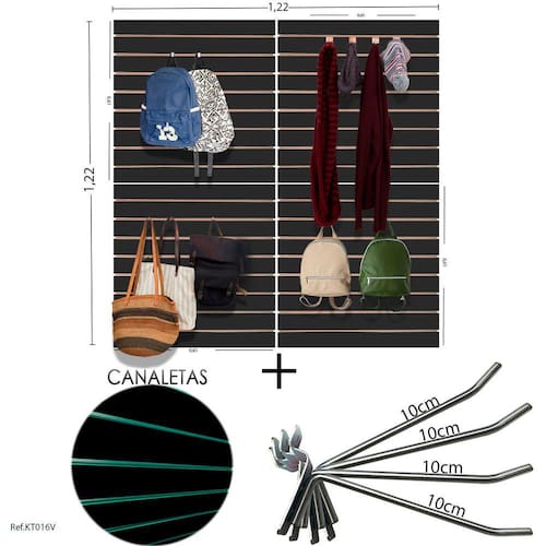DESCRIÇÃO: 4 unidades de painéis canaletados 0,61 X 0,61 + 100 Unidades de Ganchos Zincados (Tamanhos dos ganchos devem ser selecionados no ato da compra) + Canaleta Verde