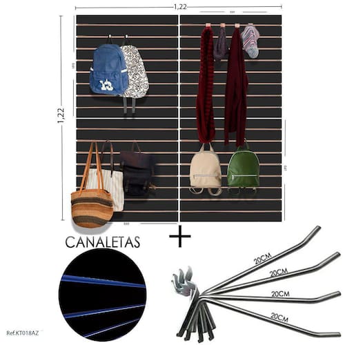DESCRIÇÃO: 4 unidades de painéis canaletados 0,61 X 0,61 + 100 Unidades de Ganchos Zincados + Canaletas AZUL