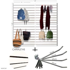 DESCRIÇÃO: 4 unidades de painéis canaletados 0,61 X 0,61 + 50 Unidades de Ganchos Zincados + Canaletas Pretas.