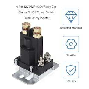 4 pinos 12V AMP 500A Switch Relay Car Starter On/Off Battery Power Dual Isolator Especificação: Quantidade: 1 Unidade Tamanho da aplicação: 7.6x5.5x8.7cm, Bottom Hole Max Length 6.7cm, Bolt Dia 0.8 cm material: metal / plástico