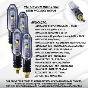 atenção não serve em fan cg 160-----somente em bros 160 Descrição Pisca led modelo cb 250 twister. atenção Este pisca possuiu coxim e parafuso. Elas não serve para motos que as setas pisca são fixados apenas por coxim Não serve em motos com setas modelo novos Aplicação: Honda cbx 250 twister. 2001 a 2008 Honda cb 300. 2009 a 2015 Honda xre 190. todas Honda titan 150 - 125. modelo abaixo de 2013 Honda fan 125 - 150. modelo abaixo de 2013 Honda nxr 160 - 150 - 125. todas Honda xr 250 tornado. todas Honda cbx 200 - 150. todas ybr 125 - 150. todas fazer 150 - 250. todas xtz 125 - 150 - 250. todas xt - tdm 225. todas Suzuki yes 125 - 150. todas Dafra speed 150. todas Obs: Serve para todas as motos que utilizem parafuso para fixação como e de parafuso pode ser adaptado em qualquer moto,nâo nos responsabilizamos por nenhuma estalaçâo ou adaptação Descrição: Produto elaborado com material de alta qualidade, testado e aprovado dentro das normas de segurança. Acompanha na embalagem: 04 pisca led. Instalação: Atenção Recomendamos que a instalação seja feita por . Não nos responsabilizamos pelo mau uso do produto,não sendo estalado como manda as orientações enviado junto ao produto e pra não funcionamento do produto,não por mal uso Marca: Não Informado