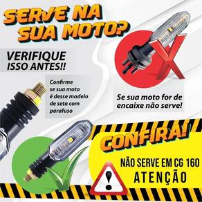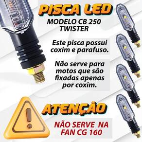 Atenção Não serve em fan cg 160-----somente em bros 160 Descrição Pisca led modelo cb 250 twister. Atenção Este pisca possuiu coxim e parafuso. Elas não serve para motos que as setas pisca são fixados apenas por coxim Não serve em motos com setas modelo novos Aplicação: Honda cbx 250 twister. 2001 a 2008 Honda cb 300. 2009 a 2015 Honda xre 190. todas Honda titan 150 - 125. modelo abaixo de 2013 Honda fan 125 - 150. modelo abaixo de 2013 Honda nxr 160 - 150 - 125. todas Honda xr 250 tornado. todas Honda cbx 200 - 150. todas ybr 125 - 150. todas fazer 150 - 250. todas xtz 125 - 150 - 250. todas xt - tdm 225. todas Suzuki yes 125 - 150. todas Dafra speed 150. todas Obs: Serve para todas as motos que utilizem parafuso para fixação como e de parafuso pode ser adaptado em qualquer moto,nâo nos responsabilizamos por nenhuma estalaçâo ou adaptação Descrição: Produto elaborado com material de alta qualidade, testado e aprovado dentro das normas de segurança. Acompanha na embalagem: 04 pisca led. Instalação: Atenção Recomendamos que a instalação seja feita por . Não nos responsabilizamos pelo mau uso do produto,não sendo estalado como manda as orientações enviado junto ao produto e pra não funcionamento do produto,não por mal uso Marca: Não Informado