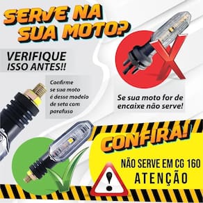 atenção não serve em fan cg 160-----somente em bros 160 Descrição Pisca led modelo cb 250 twister. atenção Este pisca possuiu coxim e parafuso. Elas não serve para motos que as setas pisca são fixados apenas por coxim Não serve em motos com setas modelo novos Aplicação: Honda cbx 250 twister. 2001 a 2008 Honda cb 300. 2009 a 2015 Honda xre 190. todas Honda titan 150 - 125. modelo abaixo de 2013 Honda fan 125 - 150. modelo abaixo de 2013 Honda nxr 160 - 150 - 125. todas Honda xr 250 tornado. todas Honda cbx 200 - 150. todas ybr 125 - 150. todas fazer 150 - 250. todas xtz 125 - 150 - 250. todas xt - tdm 225. todas Suzuki yes 125 - 150. todas Dafra speed 150. todas Obs: Serve para todas as motos que utilizem parafuso para fixação como e de parafuso pode ser adaptado em qualquer moto,nâo nos responsabilizamos por nenhuma estalaçâo ou adaptação Descrição: Produto elaborado com material de alta qualidade, testado e aprovado dentro das normas de segurança. Acompanha na embalagem: 04 pisca led. Instalação: Atenção Recomendamos que a instalação seja feita por . Não nos responsabilizamos pelo mau uso do produto,não sendo estalado como manda as orientações enviado junto ao produto e pra não funcionamento do produto,não por mal uso
