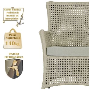 A corda nautica adiciona um toque de rusticidade moderna, enquanto o estofado impermeavel garante que sua poltrona esteja sempre impecavel, mesmo apos uma chuva inesperada ou um acidente com liquidos.
