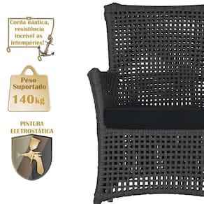 A corda nautica adiciona um toque de rusticidade moderna, enquanto o estofado impermeavel garante que sua poltrona esteja sempre impecavel, mesmo apos uma chuva inesperada ou um acidente com liquidos.