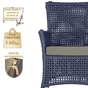 A corda nautica adiciona um toque de rusticidade moderna, enquanto o estofado impermeavel garante que sua poltrona esteja sempre impecavel, mesmo apos uma chuva inesperada ou um acidente com liquidos.