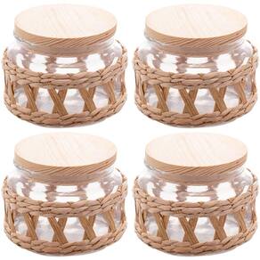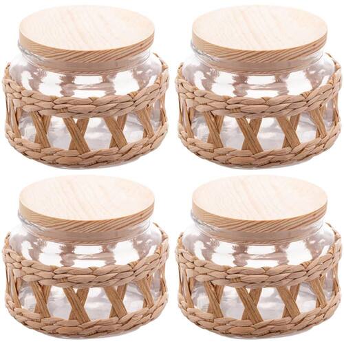 4 Potes Redondos de Vidro Vedação Hermética 350ml Madeira e Sisal Porta Mantimentos Wolff.