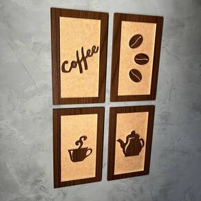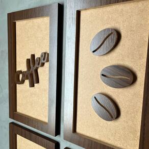 Quantidade: 4 unidades. Dimensões: 15,0 cm X 15,0 | Espessura: 1,2 cm. Material: MDF Melamínico de alta resistência e durabilidade. Molduras e figuras: MDF Melamínico Marrom amadeirado. Fundo: MDF Melamínico Branco ou Rústico (cru). Pintura acrílica somente nas bordas externas. (Pintura manual) Acompanha dupla face para instalação.