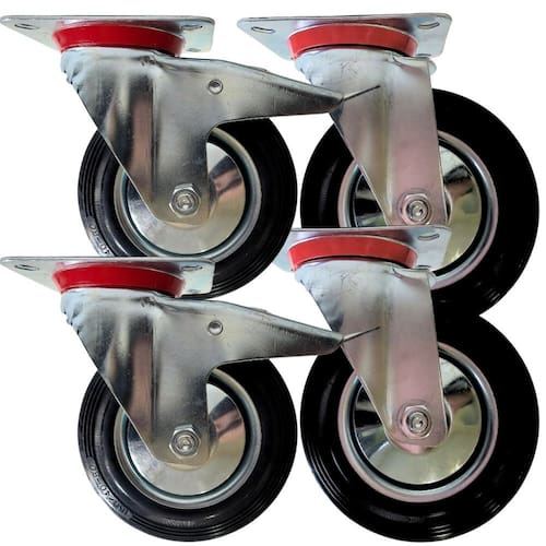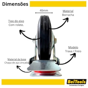 Diâmetro: 6" - 152mm. Largura da roda: 40mm. Capacidade de carga: 130kg. (por rodizio) Material: Borracha. Cor: Preto. Material da base: Chapa de aço zincada. Tipo do eixo: Com rolete.