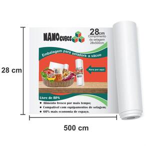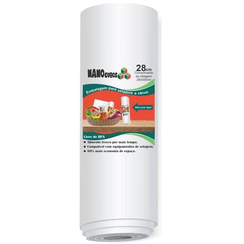 4 Rolos Nanocubos 28x500cm Sacos Ranhura para Seladora A Vácuo Embalagens 4 rolos Nanocubos 28 cm X 500 cm para seladoras a vácuo. Embalar produtos a vácuo é a melhor forma de mantê-los sempre protegidos por muito mais tempo. Ao embalar alimentos, a validade deles é completamente estendida, pois eles não terão nenhum contato com o ar e serão pouco afetados pela ação do tempo. Você pode embalar tanto alimentos crus como alimentos já preparados para serem consumidos em outro momento. Você economiza muito dinheiro e evita o desperdício Os sacos para vácuo Nanocubos são produzidos com alta tecnologia em Nylon Poli seguindo padrões de qualidade internacional. Possuem 12 micras, 3 barreiras de proteção, sem presença de BPA Não tóxicos e funcionam com equipamentos de embalagens a vácuo. Além de alimentos, é possível utilizá-lo com objetos pessoais, documentos ou utensílios, conservando-os como novos por muito tempo e aumentando sua vida útil.