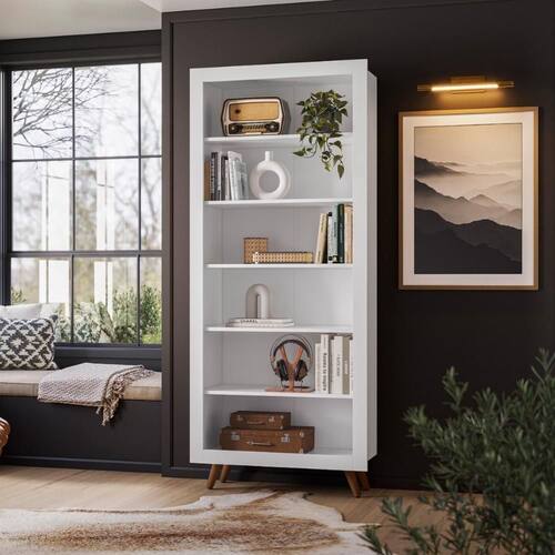 Feito em MDP 15mm, possui seis prateleiras móveis, pés com design retrô .