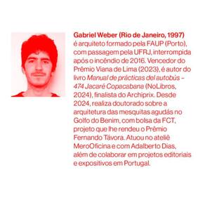 Conhecida no Rio de Janeiro como a linha do inferno, a 474 é uma rota de ônibus que atravessa a cidade de norte a sul, 7 dias por semana, 24 horas por dia. De segunda a sexta-feira a linha segue seu objetivo: alimentar a cidade maravilhosa com mão de obra barata do Jacarezinho, um dos bairros mais violentos e miseráveis da cidade. É durante os finais de semana ensolarados que a linha emerge como um personagem subversivo, pois é apropriada como uma rota de acesso à praia pelos moradores das áreas marginalizadas. O livro de Gabriel Weber, 474 Jacaré/Copacabana, é um ensaio político-arquitetônico sobre a cidade como agente de exclusão. Por meio de discursos discriminatórios, a rota do 474 tornou-se uma ferida estrutural no sistema de espaços urbanos da cidade, com códigos específicos. Mais do que um estudo de arquitetura, presenciamos uma travessia política pelo corpo da cidade – uma viagem de ônibus que se transforma em radiografia crua do apartheid social carioca. 474 Jacaré/Copacabana é um livro sobre ônibus, mas também sobre cercas invisíveis, sobre o corpo periférico contido nas fronteiras, sobre a areia da praia como território em disputa. Um livro que desafia a ilusão de cidade democrática e revela, com brutal precisão, o projeto de uma linha: conter, vigiar e punir. Se a cidade é o espelho das suas rotas, o 474 reflete um Brasil que insiste em fingir que o mar é para todos – mas só até a próxima parada. Gabriel não deixa escapar nada ao fazer uma acurada análise urbanístico-sociológica sobre o 474. O ônibus que não é só veículo e trajeto, mas também protagonista da pesquisa, é tratado pelo autor nem como herói, nem como vilão, mas um anti-herói. Tampouco romantiza a linha: trata a seco os problemas: a precarização das condições de trabalho dos motoristas da linha, os frequentes assaltos dentro do veículos e todo o tipo de cenas de violências no interior do veículo. Mas o trabalho do arquiteto-urbanista tem um norte: a tensão provocada pelo ônibus 474 expõe a fragilidade democrática e da constituição da cidadania que, além de produzir desigualdade, marginaliza e impede que seus moradores pobres exerçam o direito de circular livremente pelas cidades. Há uma montanha real e metafórica que divide a cidade. O trabalho de Weber perfura a montanha, escancara a desigualdade e mostra as tensões de classe provocadas pela passagem do 474. – Tiago Coelho, reporter da revista Piauí e roteirista