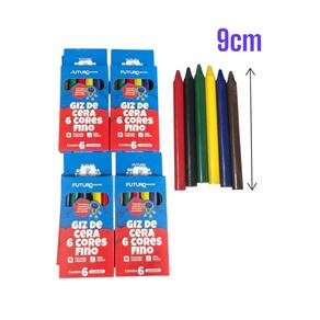 Dimensões do Giz: Fino Formato: Redondo. Composição: Ceras, carga mineral inerte e pigmentos orgânicos. Atóxico. Cor: 6 cores Embalagem: 48 caixas com 6 unidades em cada total 288 unidades de Giz de cera Segurança INmetro Registro: 0006925/2022 Marca: Futuro Escolar.