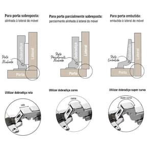 A Dobradiça tem a montagem simples, realizada através do deslizamento da dobradiça sobre o calço, que possui regulagem lateral vertical e horizontal para melhor alinhamento das portas e é fixada no calço de fixação no sistema slide-on (deslizante)