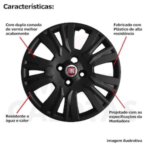 CARACTERÍSTICAS: - Fabricado em Plástico Resistente - Com dupla camada de verniz - Resistente a água e calor - Feito de acordo com os padrões da montadora - Fixação: por Parafusos - Furação: 4x100 - Cubo: Baixo - Cor: Preto - Referência: 221CB - Marca: Grid Calotas