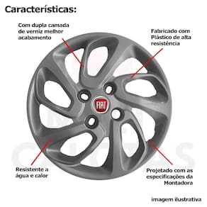 Calota em Plástico de Alta resistência, Fabricado pela Grid Calotas com os mesmos padrões e exigências da montadora. Com logotipo incluso. SERVE: Fiat Palio - todos Fiat Uno - todos Fiat Siena - todos Fiat Fiorino - exceto nova fiorino Fiat 147 - todos Fiat Elba - todos Fiat Oggi - todos Fiat Panorama - todos Fiat Prêmio - todos CARACTERÍSTICAS: - Fabricado em Plástico Resistente - Com dupla camada de verniz - Resistente a água e calor - Feito de acordo com os padrões da montadora - Fixação: por Parafusos - Furação: 4x100 - Cubo: Baixo - Cor: Cinza Grafite - Referência: 228cb - Marca: Grid Calotas ITENS INCLUSOS: - Um 1 Kit com Quatro 4 Calotas com Emblema Incluso. DIMENSÕES Unitário - Diâmetro: 39 cm - Altura: 4 cm INSTALAÇÃO A instalação é feita de forma simples, podendo ser feita por você mesmo. Não necessita retirar todos os parafusos. de 30 dias para defeitos de fabricação. SOBRE O ENVIO Envio podendo ser feito até o próximo dia útil após confirmação de pagamento. em até 3 , em caso de boleto POLÍTICA DE TROCA Sempre estamos interessados em sua satisfação. Caso não receba o produto exatamente como no anúncio, com algum defeito ou no transporte, Você poderá trocar e devolver a qualquer momento, sem pressa, sem prazo e principalmente sem custos desde que o produto esteja sem uso e na mesma condição da data da compra . No caso de devolução por compra de tamanho errado, desistência ou mudança de intenção, Neste caso o cliente deve arcar com o custo da devolução da mercadoria e nós arcamos com o custo de reenvio Da mercadoria nova.