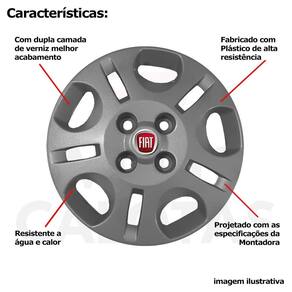 4x calota fiat mille palio siena uno aro 13 grafite 071cb Calota em plástico de alta resistência, Fabricado pela grid calotas com os mesmos padrões e exigências da montadora. Com logotipo incluso. Jogo de calotas para a linha fiat para roda de ferro aro 13. Não serve nos fiat strada - fiat palio adventure - fiat nova fiorino Características: - fabricado em plástico resistente - com dupla camada de verniz - resistente a água e calor - feito de acordo com os padrões da montadora - fixação: por parafusos - furação: 4x100 - cubo: baixo - cor: cinza grafite - referência: 071cb - marca: grid calotas Itens inclusos: - um 1 kit com quatro 4 calotas com emblema incluso. Dimensões unitário - diâmetro: 37 cm - altura: 4 cm Instalação A instalação é feita de forma simples, podendo ser feita por você mesmo. Não necessita retirar todos os parafusos. de 30 dias para defeitos de fabricação. Sobre o envio Envio podendo ser feito até o próximo dia útil após confirmação de pagamento. em até 3 , em caso de boleto Política de troca Sempre estamos interessados em sua satisfação. Caso não receba o produto exatamente como no anúncio, com algum defeito ou no transporte, Você poderá trocar e devolver a qualquer momento, sem pressa, sem prazo e principalmente sem custos desde que o produto esteja sem uso e na mesma condição da data da compra . No caso de devolução por compra de tamanho errado, desistência ou mudança de intenção, Neste caso o cliente deve arcar com o custo da devolução da mercadoria e nós arcamos com o custo de reenvio Da mercadoria nova. Marca: Não Informado