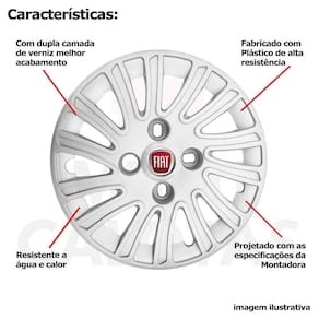 4x calota fiat mille palio siena uno aro 14 emblema 093cb Calota em plástico de alta resistência, Fabricado pela grid calotas com os mesmos padrões e exigências da montadora. Com logotipo incluso. Jogo de calotas para a linha fiat para roda de ferro aro 14. Não serve nos fiat strada - fiat palio adventure - fiat nova fiorino Características: - fabricado em plástico resistente - com dupla camada de verniz - resistente a água e calor - feito de acordo com os padrões da montadora - fixação: por parafusos - furação: 4x100 - cubo: baixo - cor: prata - referência: 093cb - marca: grid calotas Itens inclusos: - um 1 kit com quatro 4 calotas com emblema incluso. Dimensões unitário - diâmetro: 39 cm - altura: 4 cm Instalação A instalação é feita de forma simples, podendo ser feita por você mesmo. Não necessita retirar todos os parafusos. de 30 dias para defeitos de fabricação. Marca: Não Informado Ean: 7899287062985
