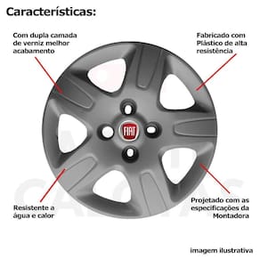 características: - fabricado em plástico resistente - com dupla camada de verniz - resistente a água e calor - feito de acordo com os padrões da montadora - fixação: por parafusos - furação: 4x100 - cubo: alto - cor: cinza grafite - referência: 111ca - marca: grid calotas
