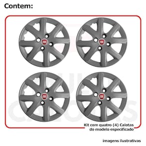 Calota em Plástico de Alta resistência, Fabricado pela Grid Calotas com os mesmos padrões e exigências da montadora. Com logotipo incluso. SERVE: Fiat Palio - todos Fiat Uno - todos Fiat Siena - todos Fiat Fiorino - exceto nova fiorino Fiat 147 - todos Fiat Elba - todos Fiat Oggi - todos Fiat Panorama - todos Fiat Prêmio - todos CARACTERÍSTICAS: - Fabricado em Plástico Resistente - Com dupla camada de verniz - Resistente a água e calor - Feito de acordo com os padrões da montadora - Fixação: por Parafusos - Furação: 4x100 - Cubo: Baixo - Cor: Grafite - Referência: 160cb - Marca: Grid Calotas ITENS INCLUSOS: - Um 1 Kit com Quatro 4 Calotas com Emblema Incluso. DIMENSÕES Unitário - Diâmetro: 39 cm - Altura: 4 cm INSTALAÇÃO A instalação é feita de forma simples, podendo ser feita por você mesmo. Não necessita retirar todos os parafusos. de 30 dias para defeitos de fabricação. Marca: Não Informado