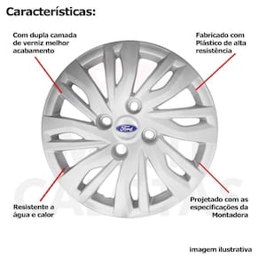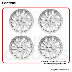 4x Calota Ford KA NOVO 2019 a 2022 Aro 14 com Emblema 344cb Calota em Plástico de Alta resistência, Fabricado pela Grid Calotas com os mesmos padrões e exigências da montadora. Com logotipo incluso. SERVE: Ford Novo Ka - 2019 a 2021 Ford Novo Ka+ - 2019 a 2021 CARACTERÍSTICAS: - Fabricado em Plástico Resistente - Com dupla camada de verniz - Resistente a água e calor - Feito de acordo com os padrões da montadora - Fixação: por Parafusos - Furação: 4x108 - Cubo: Baixo - Cor: Prata - Referência: 344CB - Marca: Grid Calotas ITENS INCLUSOS: - Um 1 Kit com Quatro 4 Calotas com Emblema Incluso. DIMENSÕES Unitário - Diâmetro: 39 cm - Altura: 4 cm INSTALAÇÃO A instalação é feita de forma simples, podendo ser feita por você mesmo. Não necessita retirar todos os parafusos. de 30 dias para defeitos de fabricação. Marca: Não Informado