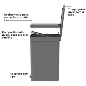 Seu design inteligente inclui um sistema de dupla repartição, permitindo a separação eficiente de resíduos recicláveis e não recicláveis sem a necessidade de duas lixeiras separadas.