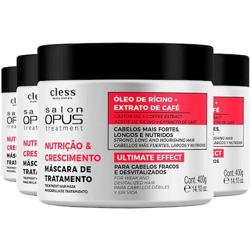 Desfrute de cabelos mais fortes, longos e nutridos com o kit 4x Máscara Tratamento Nutrição Crescimento Salon Opus Cless. Formulada com óleo de rícino e extrato de café, esta máscara é ideal para cabelos frágeis e desvitalizados, promovendo nutrição profunda e estimulando o crescimento saudável dos fios. Sua fórmula potente reforça a estrutura capilar, reduzindo a quebra e dando brilho natural.